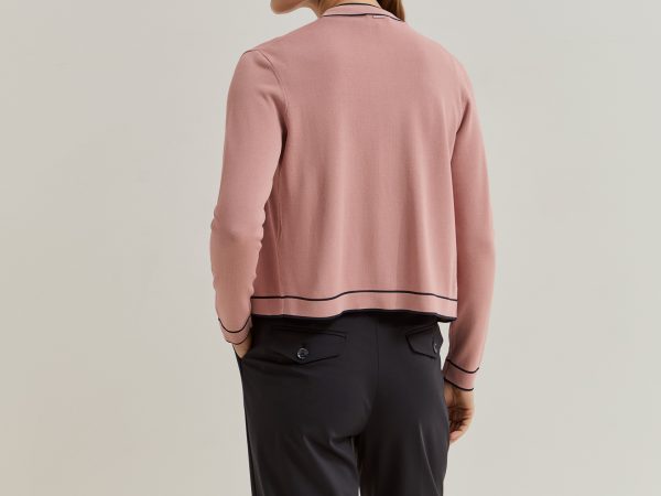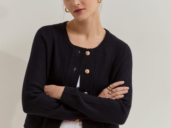 Casaco de manga comprida, em estilo de cardigan, confecionado numa malha estruturada, oferecendo um toque suave e um caimento impecável. O design destaca-se pelo elegante decote em V e abertura frontal com botões, sendo realçado por cor contraste na gola, carcela, punhos e nos dois bolsos frontais. Uma peça intemporal ideal para conferir uma camada de sofisticação e conforto a qualquer conjunto casual ou formal.Composição